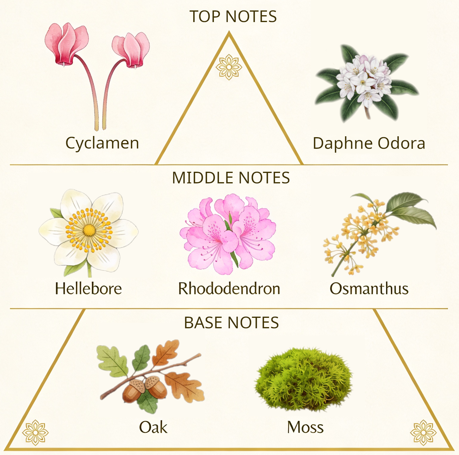 The olfactory pyramid of Aura Lauis is rich in floral essences. In the bouquet of fragrances, we find cyclamen and daphne odora as top notes, whilst the middle notes contains hellebore, rhododendron and osmanthus, and finally the base notes feature oak and moss.